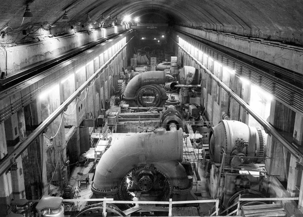 Inbetriebnahme der ersten vier Maschinensätze mit jeweils 100 MW Leistung. Ein Jahr später folgen die Maschinen 5 bis 9.