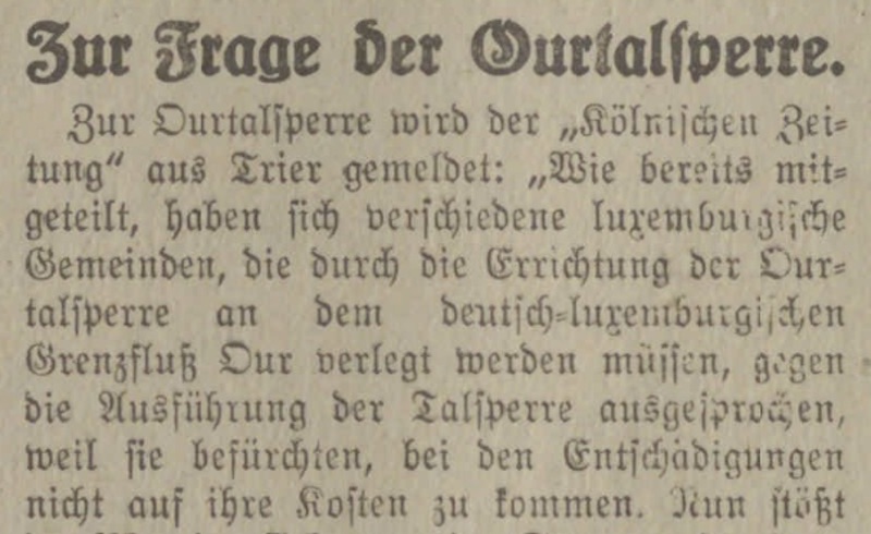 Émile Mayrisch, späterer Mitbegründer der ARBED, unterbreitet den ersten Vorschlag zur Errichtung zweier Talsperren im Ourtal.